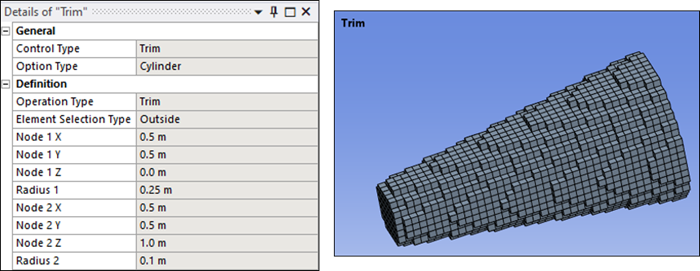 There are two primitive geometry-based options ( and ) and a mesh-based option (). For each option, data from the Operation Type (Trim or Keep) and Element Selection Type (Outside or Inside) is captured. removes the selected elements from the mesh and allows elements removed by a previous trim control to be retained.
