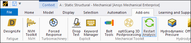 The Restart Analysis Add-on makes Static-Static or Transient-Transient Structural restart capabilities available within the Mechanical environment.