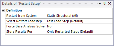 Choose any valid analysis system from the drop-down menu in this property. The analysis list is filtered based on the Restart Analysis type. If the Restart Analysis system is Static Structural, only the remaining Static Structural systems will appear in the list.