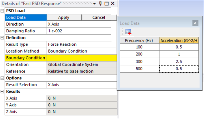 Note: Since the application uses participation factors from modal analysis to compute PSD response, you must use if is applied as contraint, otherwise results may be inaccurate.