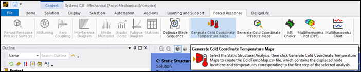 This action creates the ColdTempMap.csv file in the selected static structural solver directory, which contains the displaced node locations (X,Y and Z) and temperatures (equivalent to the user-defined result BFE) corresponding to the first step of the selected analysis.