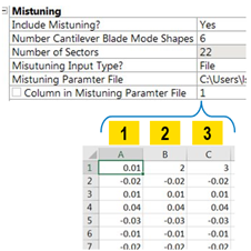 Select a .csv file. This file must contain a set of mistuning parameters per column. The Column in Mistuning Parameter File setting defines which columns will be read in the file. Using that setting, you can parameterize the mistuning parameter for each blade. The number of rows in the file must be equal to the number of sectors.