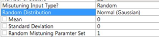 Choose between (Gaussian) or distribution. A new set of random mistuning values will be generated every time the Random Mistuning Parameter Set value is changed. You can perform several analyses using the same random mistuning value. The random mistuning values are saved for later review.