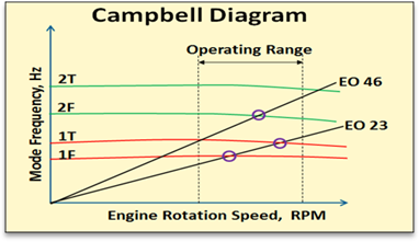 Resonance crossing between excitation (EO line) and mode frequency must be identified and forced response estimation is performed