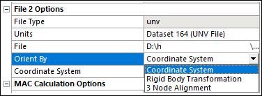 Input File 2 using a File dialog. When the file is set, the rest of the File 2 Options are populated, the MAC Frequency Worksheet is populated, the UNV Node Worksheet appears and the File 2 geometry is displayed in the Geometry view. If File 2 is a unv file, its format needs to comply with the restrictions in UNV File Restrictions. Contrary to 2023 R2 and earlier versions, File 2 is not copied to the MAC Calculator subfolder (located in the analysis solver files directory). This setting holds the absolute path to the file and you may therefore need to reload the file if renamed, moved to a new location or deleted.