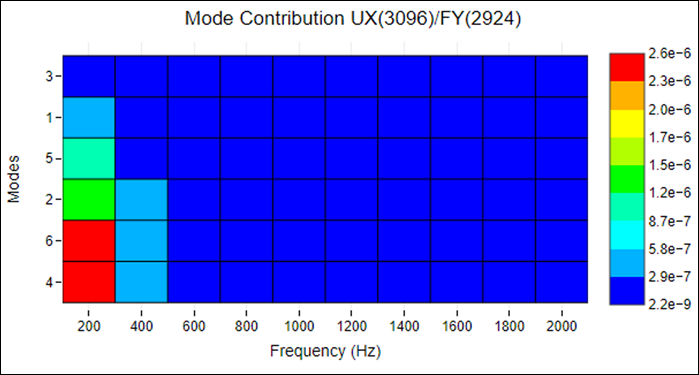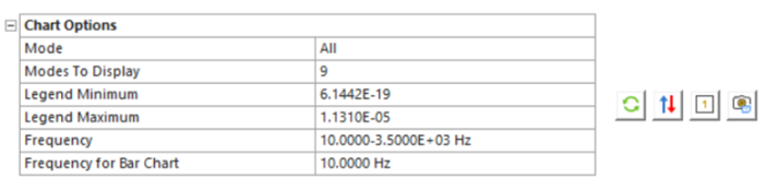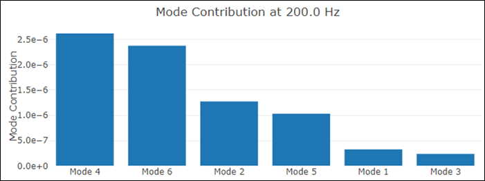 A dynamic plot that allows hovering, zooming and panning operations. This data displays the mode contribution information for the frequency specified using the Chart Options in the Details panel. The number of modes is also controlled by the Chart Options. The data will be sorted from maximum to minimum for the specific frequency selected.