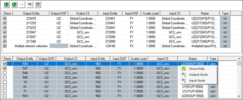 If the DOF pair is selected/cleared, it is displayed/not displayed in the FRF Plotter. This action supports multi-selection (if several rows are selected, and the action is selected, all rows are shown/hidden).