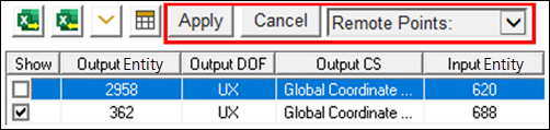 The contents of these columns are modified through a dropdown menu inside the cell that is populated with all the applicable DOFs for the given node. For the Output DOF, the format of the selection explicitly indicates Displacement (UX, UY, UZ) and Rotation (ROTX, ROTY, ROTZ). For the Input DOF, the format of the selection explicitly indicates Force (FX, FY, FZ) and Torque (MX, MY, MZ).