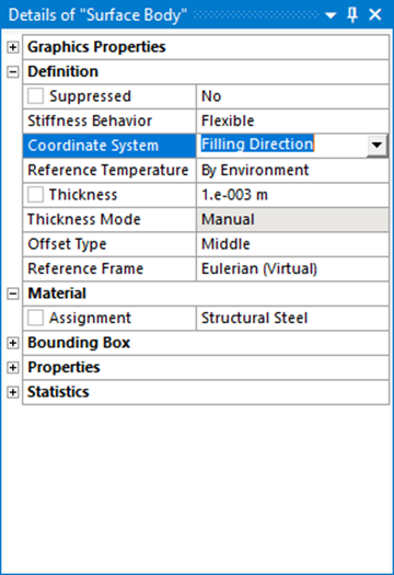 The domain of the 3D Multi Material Euler (MME) solver can be filled with material and initial conditions using a single connected surface body in combination with a filling direction. The filling direction is defined by the direction of the z-axis of a local coordinate system, which is scoped to the Eulerian filling surface. To be used as a filling coordinate system, the origin of the local coordinate system should not coincide with the origin of the global coordinate system.