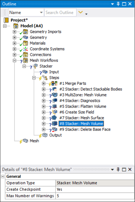 Execute Up To Step: Executes the Stacker: Mesh Volume step for the specified mesh workflow.