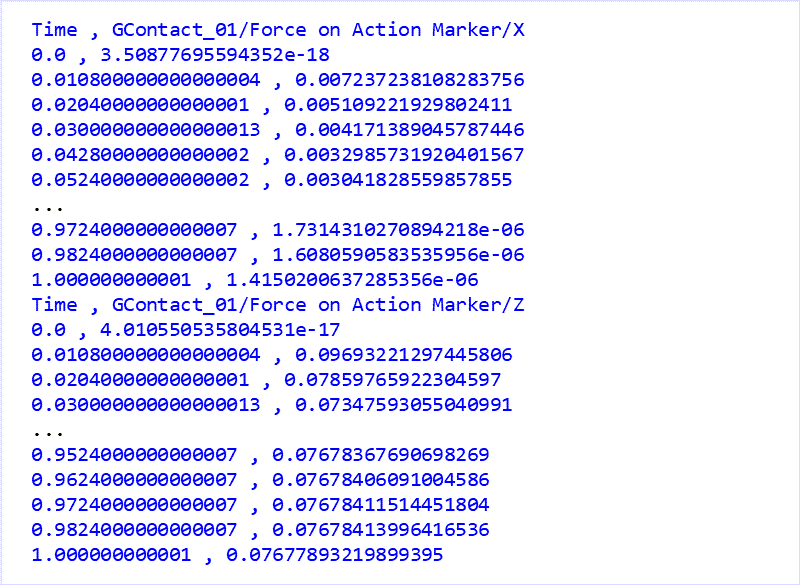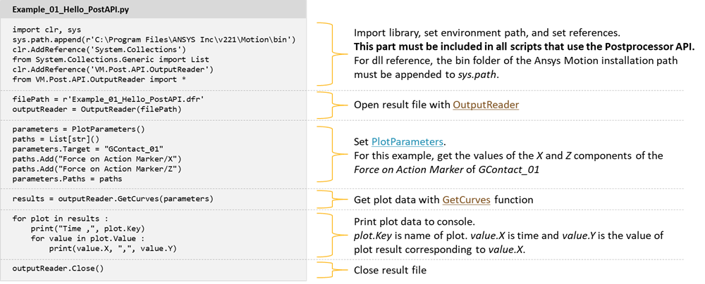 Contents Chapter 4: Chart | 4.9. Postprocessor API (Python Script) | Print page 4.9.2. ExampleA simple example of a Python script to print plot data is shown below. The output of the example code is as follows. For more information, see 'Postprocessor API for Python.pdf'. « 4.9.1. Setup Requirements Chapter 5: Analysis »