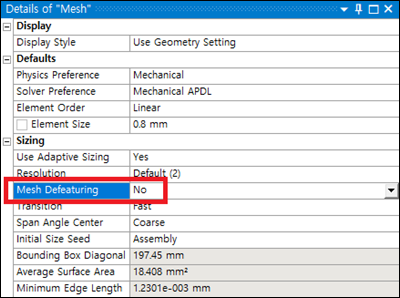 The issue is caused by the Mesh Defeaturing mesh option, which is intended to be used when meshing Flexible Bodies to prevent very small edges or surfaces from ruining the overall mesh geometry. This should not, however, be the case for Rigid Bodies and if a small edge or face is ignored, it can cause a mismatch between the NURBS and the patch on the contact surface. Changing the Mesh Defeaturing option to (see below) will ensure that a single Contact Patch will be contained within a single surface (as shown in the right-hand figure above).