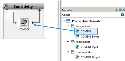 From the Modules > Process chain elements > Integrations folder, drag the COMSOL node into the Sensitivity system and let it drop.