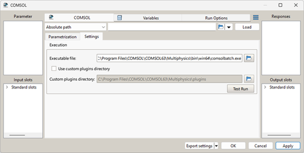 Note: From version COMSOL 6.3 onward, you must use command-line script (a batch file (*.bat) or a command script (*.cmd)) path in Executable file to run the COMSOL and set the Custom plugins directory. The batch file or command script must contain the following: