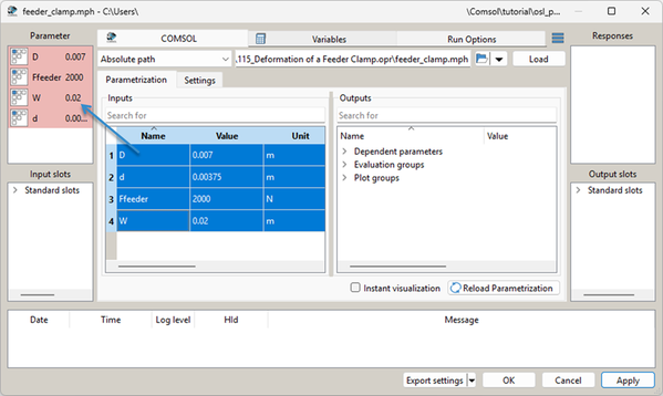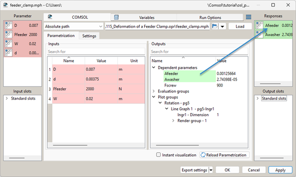 In the Parametrization tab, browse the reference folder *.opr and select the feeder_clamp.mph file.