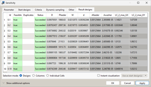 To review the result, double-click the Sensitivity system and switch to the Result designs tab.