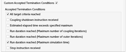 | Accepted Termination Conditions | False | This check box and the associated subordinate check boxes allow you to precisely adjust the conditions under which optiSLang will declare a finished design point successful or failed. This group of settings affects only how a finished CFX-Solver run is interpreted, and not how the run is started, executed, or terminated. The (default) collapsed setting has the same effect as the expanded state with subordinate check boxes activated as in the following image. The success label will be attributed based on a logical OR combination of all conditions checked in the sub-selection. By default, the only termination condition selected is All target criteria reached and Run duration reached (Maximum simulation time). |