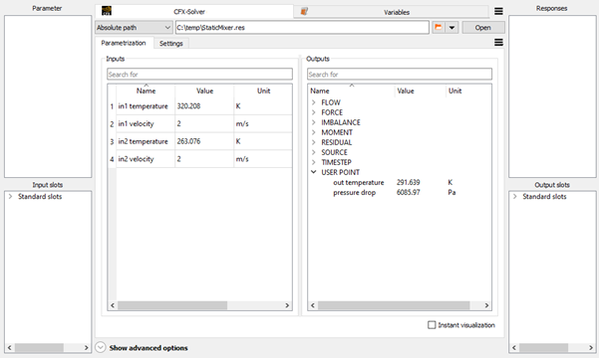 Input parameters can be any expression defined in CFX in the Expressions section. The reference case must be configured such that all required inputs are defined as expressions. For details, see the Expressions section in the CFX-Pre User’s Guide. Available input parameters are listed in the Inputs list after the reference file is loaded.