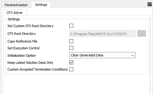| Set Execution Control | False | Specifies whether execution control settings will be set. This setting controls the visibility of the Edit button and the Custom Solver Arguments setting. The Edit button opens the CFX-Solver Manager, allowing many execution control settings to be edited. For details, see The Define Run Dialog Box in the CFX-Solver Manager User's Guide. |