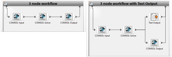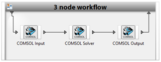 The workflow consists of the three separated COMSOL nodes (COMSOL Input, COMSOL Solve, and COMSOL Output) as shown on the image below: