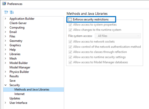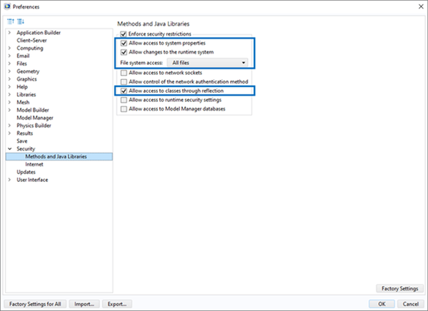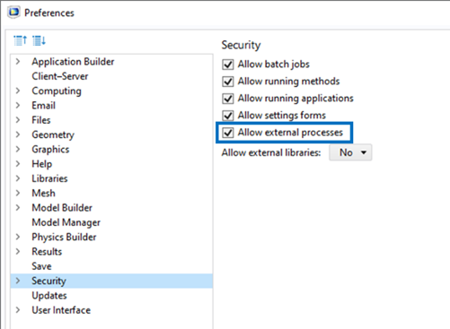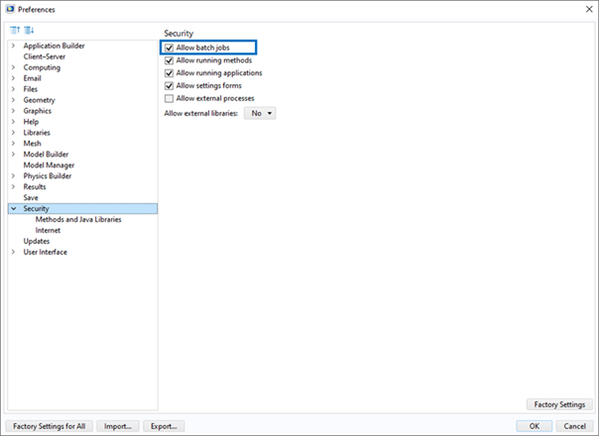 The following security permissions must be enabled in the COMSOL Preferences to run the COMSOL node using the comsolbatch command: