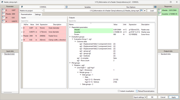 Only parameters with scalar values without mathematical expression are imported to the COMSOL node. As demonstrated in the example in the previous figure, only the parameters D, d, Ffeeder and W are imported as parameters to the COMSOL node.
