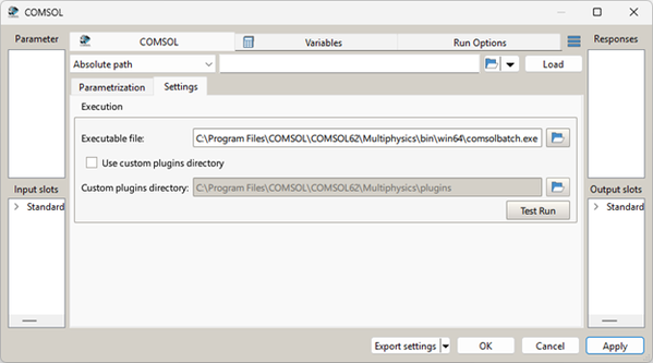 Custom plugins directory - path to the COMSOL plugins directory. If disabled or empty, the default path is derived from the specified Executable file setting.