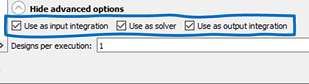 ** input = Use as input integration option is checked; solver = Use as solver option is checked; output = Use as output integration is checked