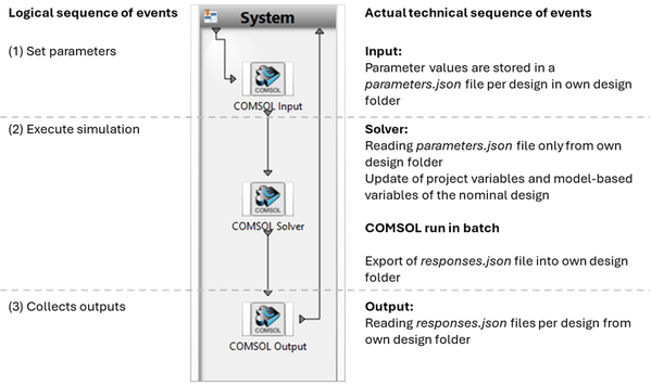 Each intent of COMSOL execution is associated with specific usage modes of the COMSOL node; see column "Node usage modes" in Table 1. For example, if usage mode of COMSOL node is "input" or "output", the COMSOL will be executed only to extract parameters and responses. Based on that, a COMSOL node can be divided into three distinct nodes, each with its own usage mode: input, solver, and output. Consequently, different command-line scripts or comsolbatch executables can be specified for each node.