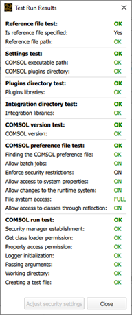 The failure of the COMSOL preference file test or COMSOL run test can be caused by the COMSOL security settings. These settings can be changed manually in COMSOL; see the Solver section for more information. For user convenience, the COMSOL security settings can be adjusted directly in COMSOL integration node by clicking the Adjust security settings button. This functionality adjusts the desired security settings in the COMSOL preference file.