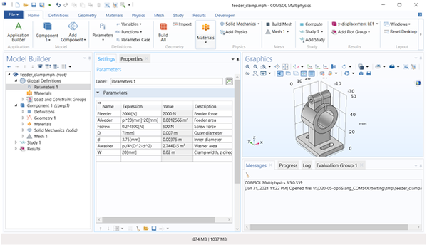 | Deformation of a feeder clamp | https://www.comsol.com/model/deformation-of-a-feeder-clamp-115 | Dimensions of model, load | Max. displacements in X, Y and Z, directions | Evaluation Group 1 with object Volume Maximum 1 to evaluate responses max. displacements in X, Y and Z directions |