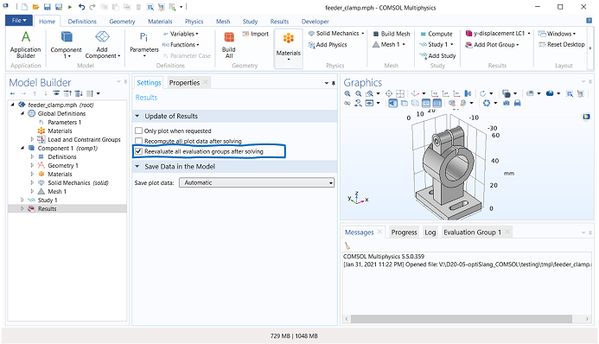 To ensure that the data in Evaluation Group is updated after each design is solved, select the Reevaluate all evaluation groups after solving check box in the Results object settings. Another possibility for updating the Evaluation Group is the utilization of Sequences in Study > Job Configurations. See the Solver section for more information.