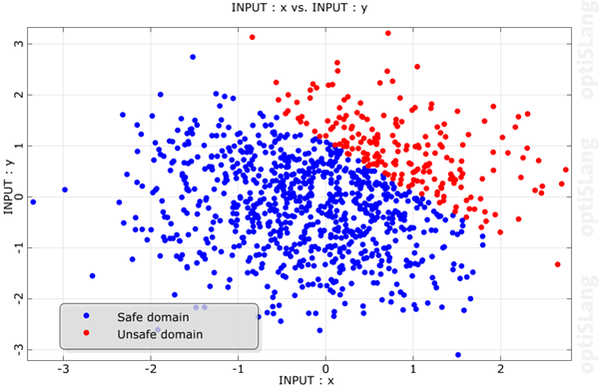 This plot displays a 2D-projection of the parameter space of all successful designs. The safe designs are colored blue and the unsafe are red. For directional sampling, the designs on the limit state function are colored cyan. For FORM and ISPUD, the most probable failure point is colored orange. They are plotted in different layers. The 2D-projection room is chosen by the 1st and 2nd dimension selection in the Common settings pane. Displaying the input parameter values in standard Gaussian space instead of the originally defined distribution values, can be selected in the Common settings pane. You can also select designs in this plot. When selected, the design numbers are displayed. The title label contains the selected parameters.