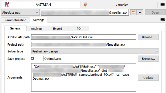 In the > tab, select the path to the AxSTREAM.exe file and set the solver type. Optionally, you can save the modified file with the same or different name after the AxSTREAM solver execution. To save the project with the same name, select the Save project check box. To save the project with a different name, check the Save project check box and specify the name of the project (NAME.axx). To review the command line for solver execution, click in the Arguments section.