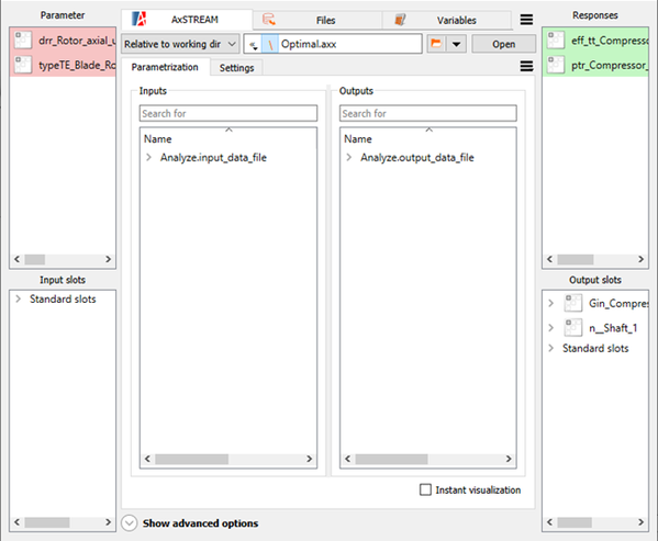 You do not need to manually setup input or output parameters. The input files and output files loaded into the AxSTREAM connector are automatically recognized and all the variables are placed into the appropriate fields. Once the variables are recognized, inputs can be dragged and dropped to the Parameter or Input slots fields and outputs to the Responses or Output slots fields.