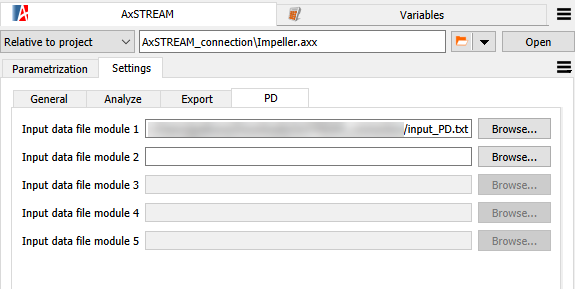 The PD tab allows you to load input files for the preliminary design task. Each input file corresponds to a specific turbomachinery module (group of stages sharing similar characteristics). Currently, the AxSTREAM Preliminary Design supports the use of five input files (five different modules). To extract the result data from the Preliminary Design solver, the output file in the Analyze tab is used.