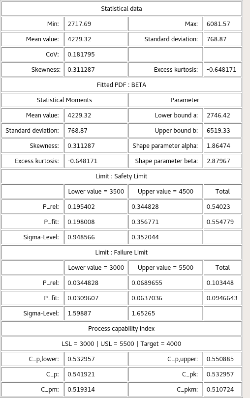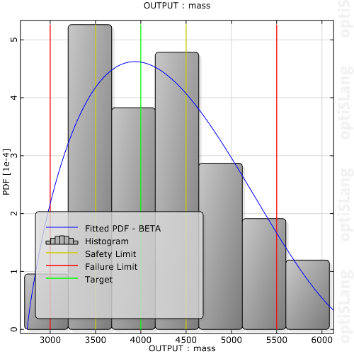 This plot displays the histogram of a chosen input or output parameter. Additional information about estimated statistic values (mean, minimal and maximal value, standard deviation, coefficient of variation, skewness and kurtosis) are provided in a text field. If a distribution function is provided for the chosen input parameter, this function is also plotted (green line). You can fit a Probability Density Function (PDF) to the data set (blue line). You can also calculate certain probabilities from the quantiles of the histogram and the visualized PDFs. If the data set contains failed designs and the chosen parameter is an input parameter, a second histogram that includes the failed designs is shown (dotted line).