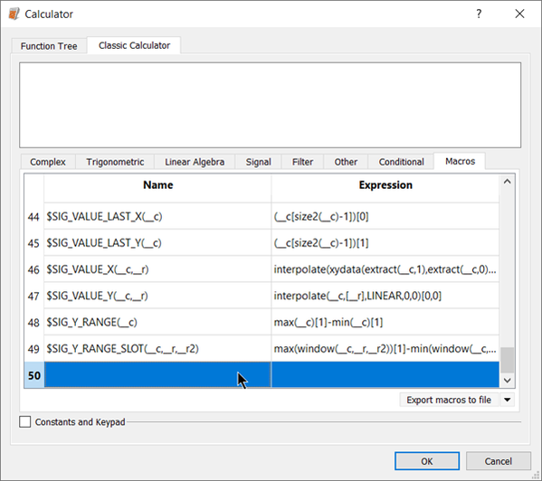 To use macros from other users, rename a copy of the other user's macros.def file and place it into the Ansys/optiSLang/calculator directory. When starting the application, or loading a project file, all files in the Ansys/optiSLang/calculator directory are scanned and all available macros are added to the Macros tab. If the macros are now saved (either by saving the project file or by shutting down the application) all macros in the Macros tab are only written into the macros.def file.