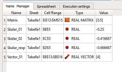 If the workbook contains named ranges the Name Manager tab is displayed by default. You can use this tab to register named ranges to parameters, responses and slots. This creates a faster workflow, instead of manually selecting cell ranges in the Spreadsheet tab. Depending on the dimension of the range, optiSLang converts it to the corresponding data type. If the workbook does not contain any named ranges or if they cannot be read by optiSLang, the Name Manager tab does not appear.