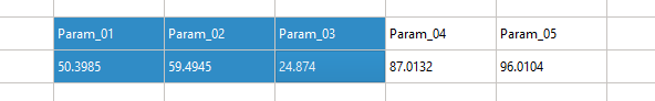 Scalars: The cells with the parameter names and the corresponding value cells must be direct neighbors. Either the name cells are left or above the value cells. When you select the first name cell, press Shift and select the last value cell. You can add a full parameter block as input or output parameter using drag and drop.