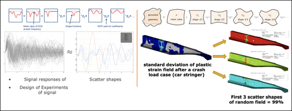This next image shows variation patterns (scatter shapes) and random field schematics. The left side are the identified variation patterns of a DOE of curves. On the right side are simple FEM solutions distributed on a mesh.
