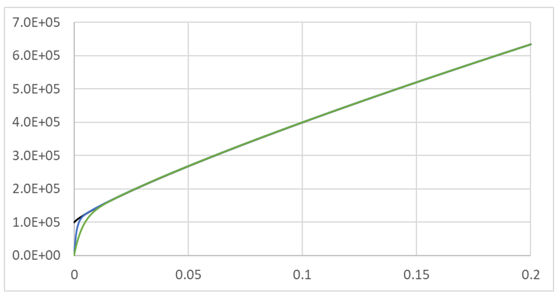 the expected behaviour (black) for two different values of : 0.001 m/s (blue) and 0.003 m/s (green). The departure