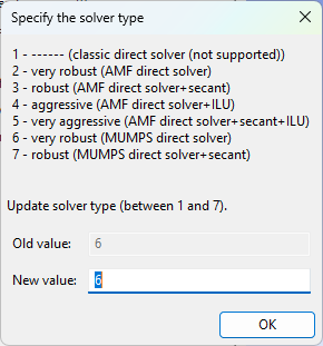 Ansys Polyflow Classic provides a variety of solvers; some are pure direct solvers, while others combine direct and iterative techniques. You can select the solver through the Numerical parameters menu of the F.E.M. Task. In the Numerical parameters menu, click Modify numerical parameters for iterations to access the Numerical parameters for iterations menu. Here, you can select the Modify the solver aggressivity item and select one of the available solvers, which are described in the sections that follow.
