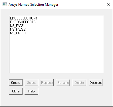 Select Named Selection Manager from the Ansys drop-down menu to display a dialog box.