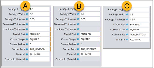ENABLED (default): Unused properties are visible for a given part and are editable. In the images below, package properties are shown for the same part. Although Overmold Thickness, Laminate Thickness, Corner Radius, and Overmold Material do not apply to this part, Sherlock displays these properties and allows you to edit them when ENABLED is selected. See image A.