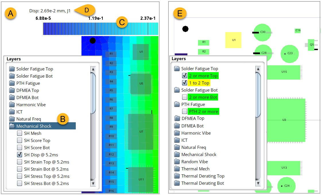 Image A shows how you can use the Layer Viewer to generate a graphical representation of board stress, strain, or displacement by selecting the relevant option in the Layer Viewer Tree (B). The available viewing options depend on the analysis type selected and how you configured the analysis. Here, the Layer Viewer displays board displacement at 5.2 ms for a Mechanical Shock analysis. A color scale (C) is provided for interpreting the display. For even more detail, hover over any element to see the numerical result displayed in the upper left (D).