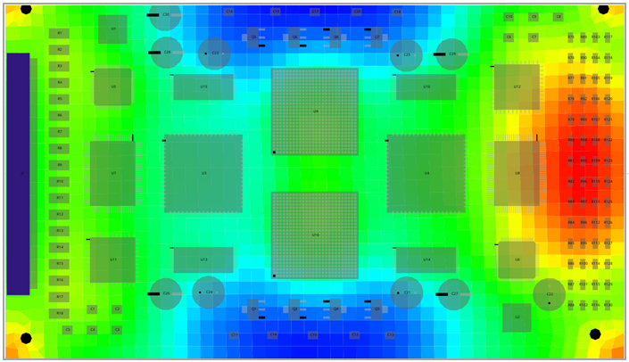 The Sherlock Layer Viewer can also display part scores using the color-coded scoring system. In the example below (E), scores from a Solder Fatigue analysis are shown with most parts shaded green (Passable). Component U1 For a complete explanation of the scoring system, see Color-Coded Scoring System.