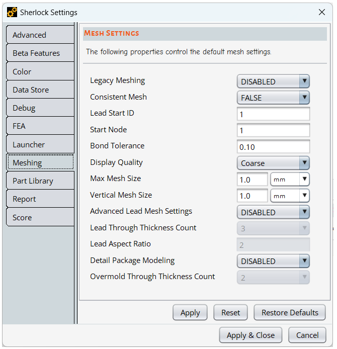 Note: You can also set the Lead Through Thickness Count and the Lead Aspect Ratio in the Lead Modeling tab of the Analysis Properties window when setting up your FE analysis. Until you run your first analysis with Advanced Lead Meshing enabled, Sherlock defaults to the values you have chosen in the Sherlock Settings window. For a more detailed explanation of Advanced Lead Meshing and guidance on choosing optimal settings, see Advanced Lead Meshing.