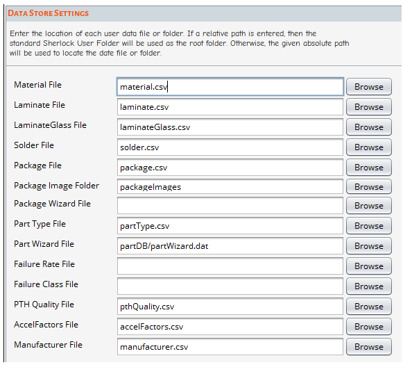 The Data Store Settings control the location of each user data file or folder. If a relative path is entered, the standard Sherlock User Folder will be used as the root folder. Otherwise, the specified absolute path will be used to locate the data file or folder.