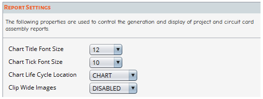 The Report Settings control how project and circuit card assembly reports are displayed. See Generating Report Files.